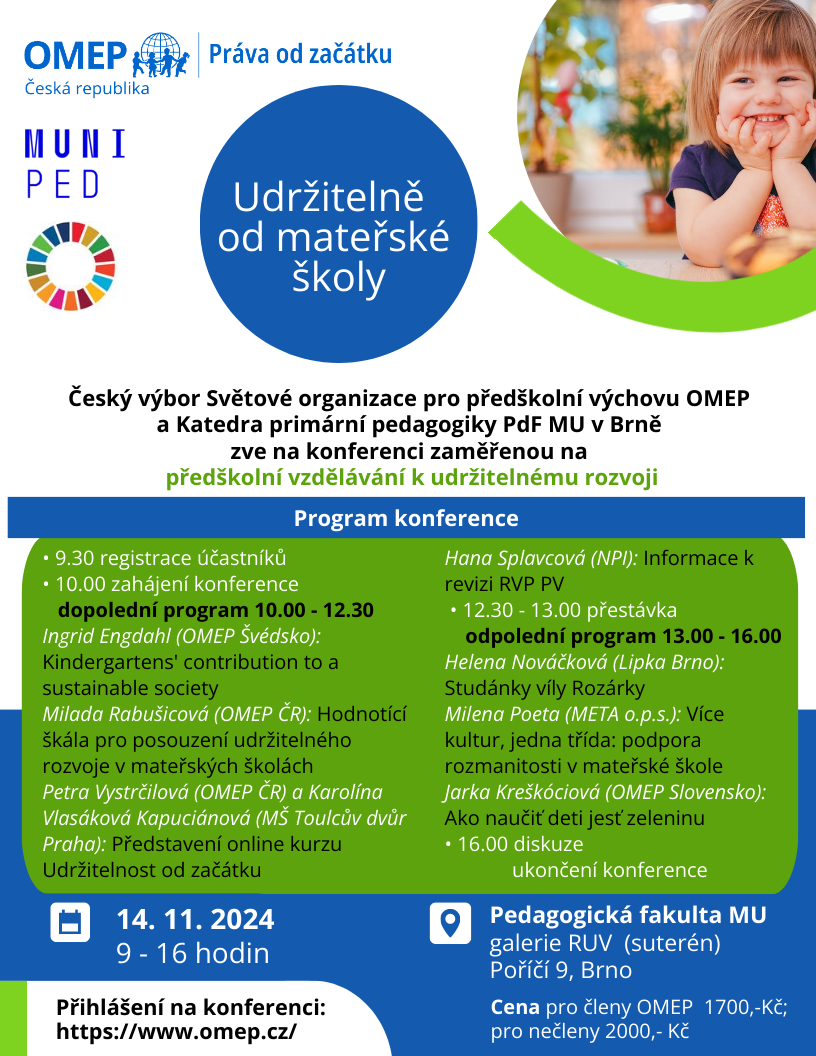 Udržitelně od mateřské školy - Český výbor Světové organizace pro předškolní výchovu OMEP a Katedra primární pedagogiky PdF MU v Brně zve na konferenci zaměřenou na předškolní vzdělávání k udržitelnému rozvoji. Téma udržitelného rozvoje patří k přirozenému uvažování o světě, ve kterém potřebujeme zajistit jeho fungování ve vzájemné rovnováze environmentálního, ekonomického a sociálního pilíře pro budoucnost dalších generací. Rozvoj, ale i potřeba změn ve společnosti, aby se stala udržitelnou, musí mít dostatečnou oporu ve vzdělávání. Není přitom důvod, proč udržitelný rozvoj nezahrnout již do práce s dětmi v mateřské škole. Zazní příspěvky nejen z českého prostředí, ale o své zkušenosti z dlouholeté praxe v aplikaci udržitelného rozvoje do vzdělávání dětí od raného věku se podělí také Ingrid Engdahl ze Švédska. Akce se koná 14. listopadu 2024 v Brně.