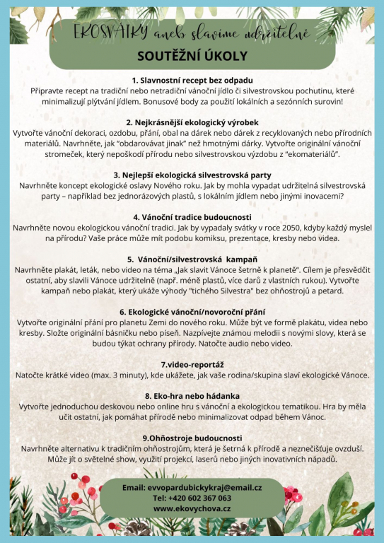 Vánoce jsou v poslední době čím dál více označovány za komerční svátky, což do značné míry odpovídá realitě. Pojďme ale ukázat, že je možné je slavit i jinak - s ohledem na udržitelnost, ohleduplnost a pravé hodnoty těchto svátků. Návodů na to, jak pojmout Vánoce a silvestrovské oslavy ekologicky, existuje mnoho. Nezůstávejme však pouze u čtení, ale aktivně se zapojme do změny. Jednou z možností, jak k této změně motivovat své okolí, je zapojit se do krajské EVVO soutěže, kterou nyní vyhlašujeme. Cílem soutěže je zapojit se do přemýšlení o udržitelných Vánocích, podporovat kreativitu a inspirovat k tomu, jak slavit svátky šetrně k přírodě. Tentokrát však soutěž není určena pouze dětem, ale všem lidem bez ohledu na věk. Zapojit tak můžete děti, členy vašich kroužků a spolků, rodinu, přátele i své známé. Věříme, že Vánoční prázdniny a svátky mohou být skvělou příležitostí k zamyšlení nad touto tématikou.