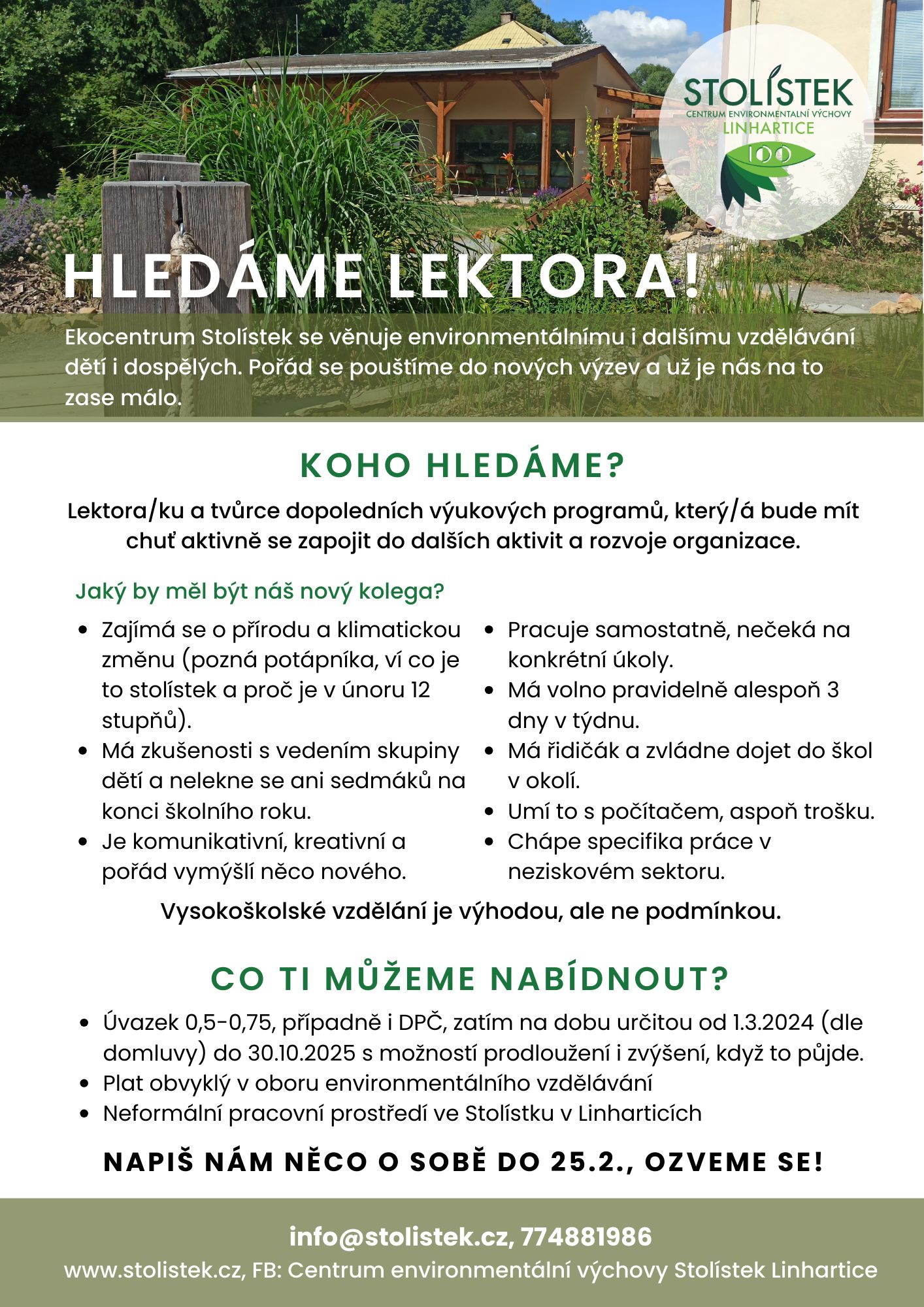 Ekocentrum stolístek hledá do svého týmu lektora/ku výukových programů. Žádosti posílejte do 25.2.2024